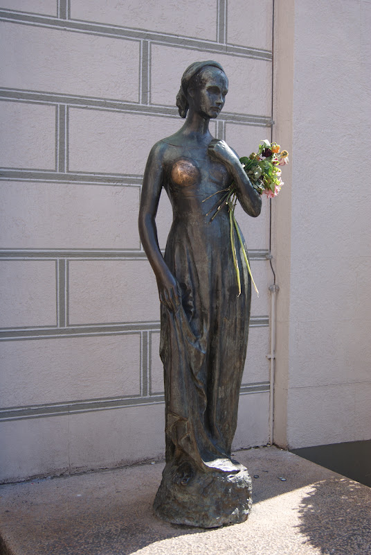| A bronze woman at the entrance of the market area we were in. Obviously a fair few perverted people pass by here. But someone was nice enough to bring her flowers. |